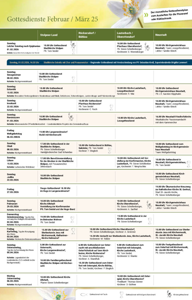 Gottesdienste AlleAnstehend Termin Informationen: So.09Juli2017 Gottesdienst9.30 Uhr St.-Jacobi-Kirche NeustadtPfarrer Prüfer